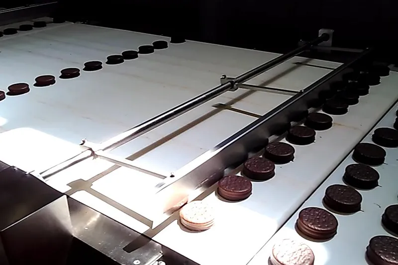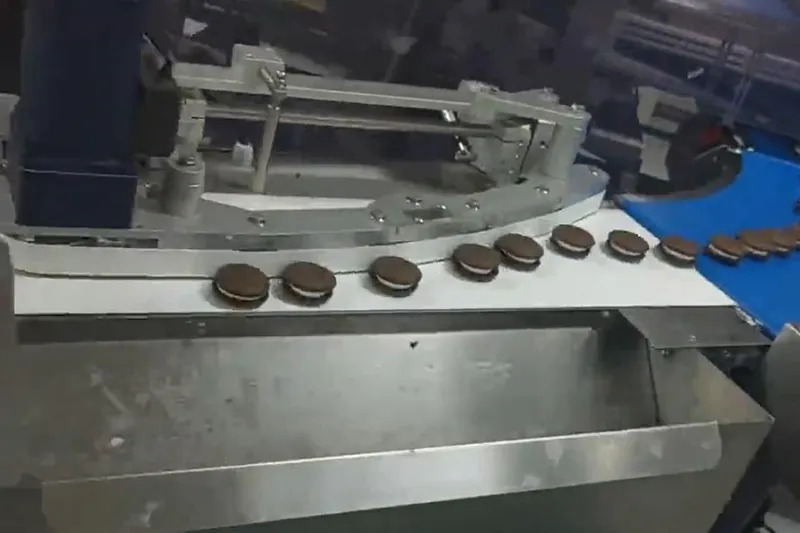 The packaging line starts from the cooling conveyor after baking. Cakes, pies, or breads are then transferred to the packaging machine through a row distribution feeding system and servo-driven automatic feeding belts, ensuring smooth and stable product flow. An optional function for automatic transfer to a standby packaging machine is available, further improving production line flexibility and efficiency.