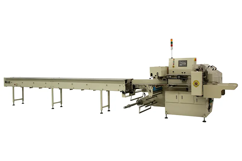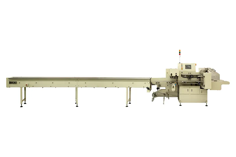 SF-DH3 horizontal flow wrapping machine adopts bottom film feeding, forming, and heat sealing, and is equipped with automatic film feeding, stepless speed regulation, and photoelectric registration, delivering efficient and stable operation with neat finished packaging. It adopts reciprocating transverse sealing, making it more suitable for taller-sized products, providing improved corner tucking, a more attractive packaging appearance, and stronger sealing performance.