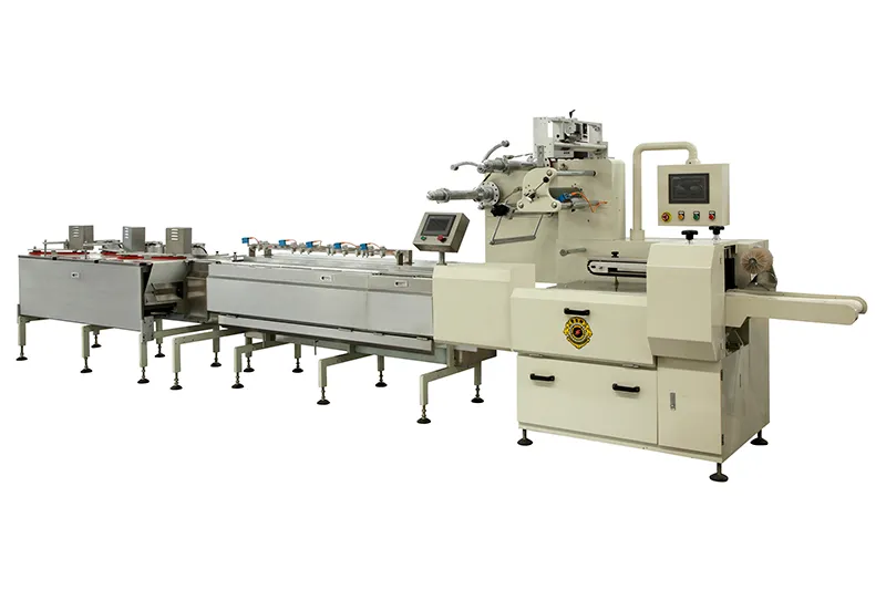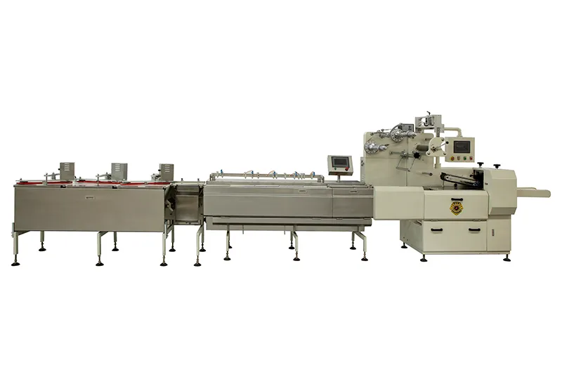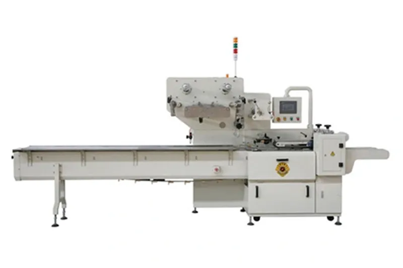 This horizontal flow wrapping machine can be used for packaging regular solid products, as well as products requiring nitrogen filling or alcohol spraying, such as: